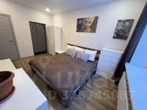В комнате установлены два спальных места. Из окон открывается вид на городскую панораму. Лоджия застеклена и отделана кирпичом, что создает дополнительное пространство для отдыха.