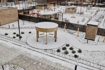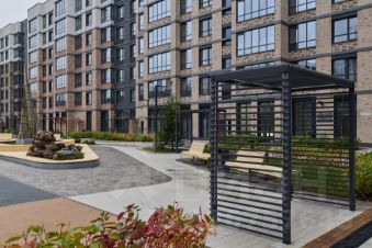 Окна выходят во двор, закрытый от машин. Двор ЖК озеленен и оснащен детскими площадками, велопарковками и зонами отдыха. Также во дворе располагается детский сад.