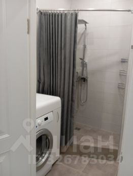 Санузел совмещённый с душевой, выполнен в светлых тонах, сделан тёплый пол. В санузле установлена стиральная машина.
