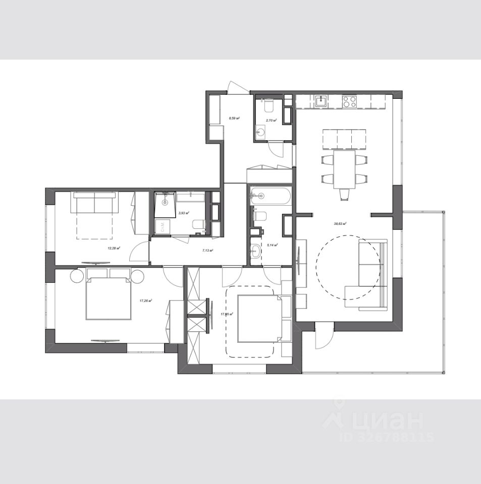 Общая площадь квартиры составляет 120 м2 Кухня-гостинная 40м2 Три комнаты изолированные.