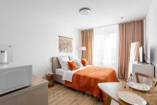 - мини-кухня (холодильник, варочная панель, микроволновая печь, чайник, кофеварка, посуда и тд)
