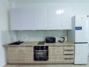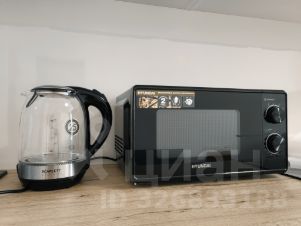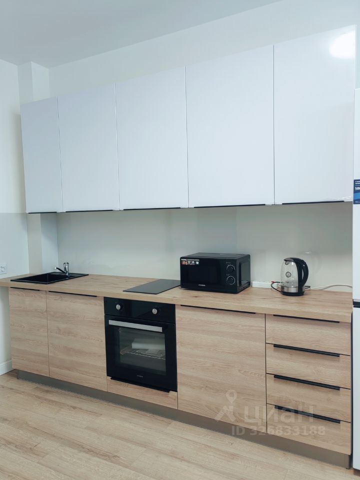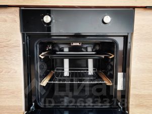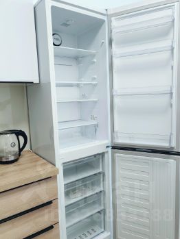 Кухня-гостиная 19 м2 оборудована кухонным гарнитуром со встроенными варочной поверхностью и духовым шкафом, большим 2-камерным холодильником с системой No Frost, микроволновой печью, электрическим чайником, столом и стульями.