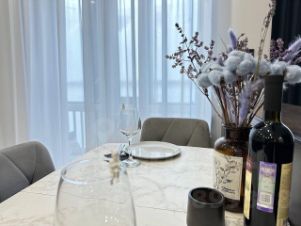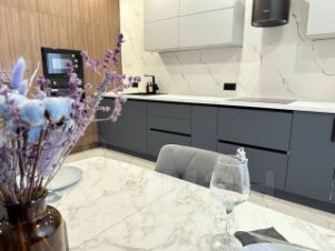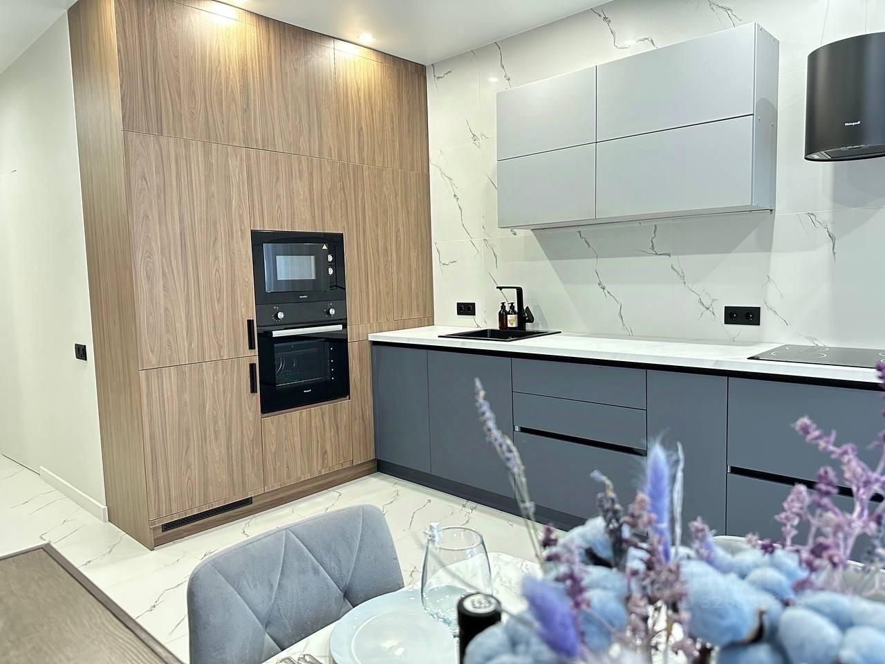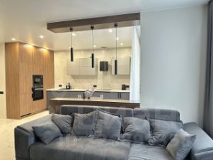 Кухня впечатляет своим современным дизайном и большой площадью , оснащена всей необходимой техникой, включая встроенные духовые шкафы. Просторная гостиная с удобным диваном и телевизором создает уютную атмосферу для отдыха.