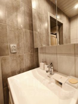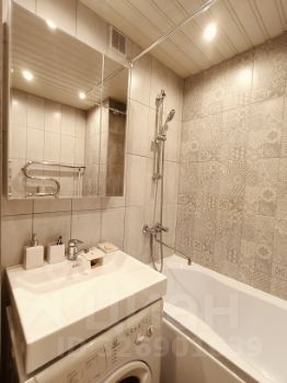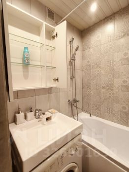 Кухня компактная, оснащена необходимой техникой: холодильником, плитой и стиральной машиной. Санузел совмещенный, с современной сантехникой и небольшой ванной.