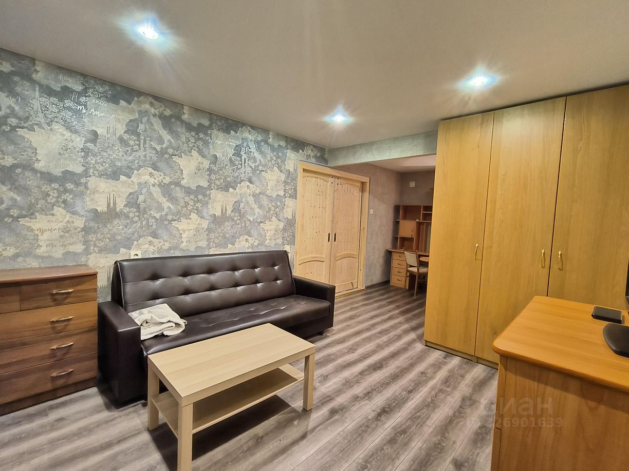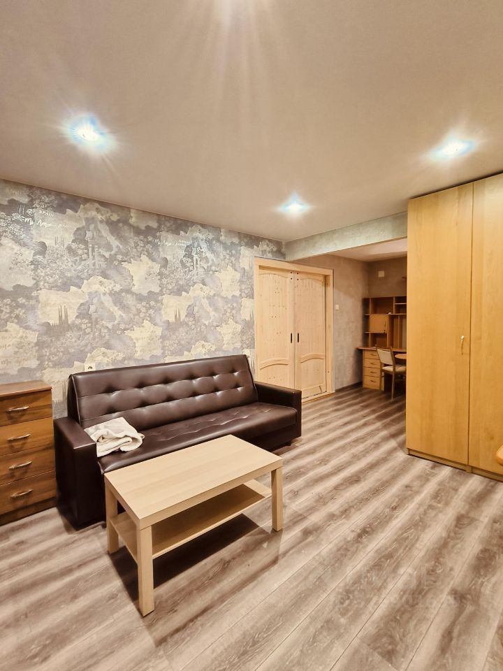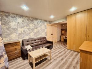 Квартира расположена на 4 этаже кирпичного дома с двумя пассажирскими лифтами. В квартире выполнен косметический ремонт, что создает приятную атмосферу. Просторная комната оборудована шкафами и диваном, а также рабочим столом и стулом.
