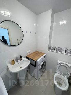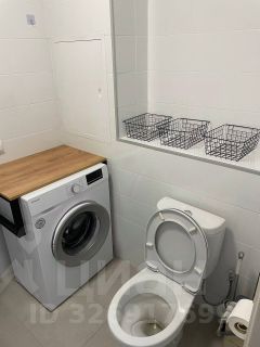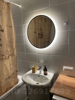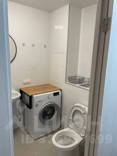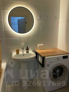 Санузел совмещенный, оснащён современной сантехникой и стиральной машиной. Также в ванной комнате для удобства установлено зеркало с подсветкой (можно включать как совместно с основным освещением, так и отдельно только зеркало).