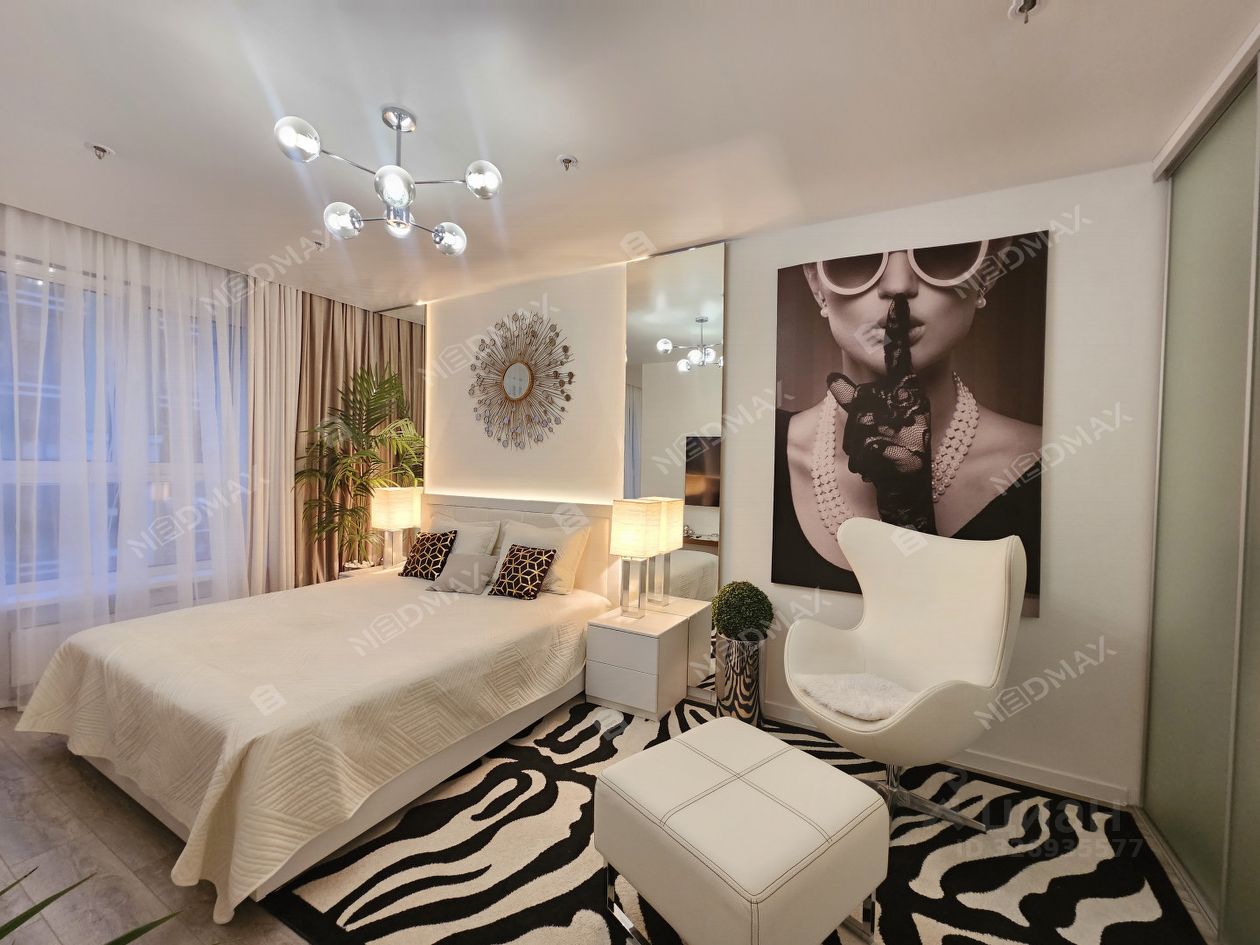 Квартира с хорошим ремонтом и эргономичной планировкой. При входе организована достаточно вместительная гардеробная. Просторная спальная комната, встроенный шкаф с подсветкой. Есть туалетный столик. Кровать 180200, ортопедический матрас askona.