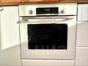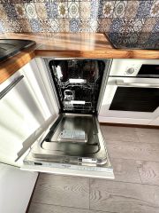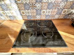 Кухонная зона отделена от жилой барной стойкой с барными стульями. Большой кухонный гарнитур включает в себя достаточно шкафов для хранения посуды и кухонных принадлежностей. Также есть двухкамерный холодильник, посудомоечная машина, индукционная варочная поверхность на 4 комфорки, вытяжка, духовой шкаф с грилем. Вся техника импортная, качественная. Есть термопот - он поддерживает постоянную температуру горячей воды.