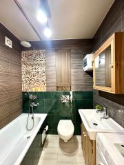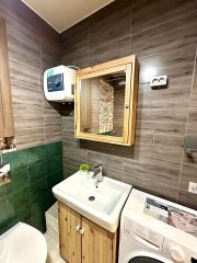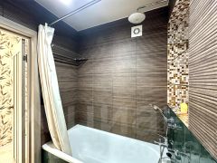 Санузел совмещенный, с ванной, стиральной машиной и достаточным количеством мест хранения - шкафчики, полочки. Санузел полностью отделан кафелем. Есть теплый пол.