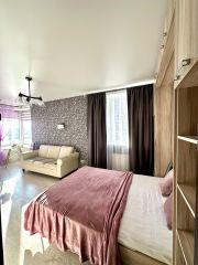 В жилой зоне есть двуспальная кровать-шкаф с ортопедическим матрасом. Она легко поднимается, убирается в шкаф и освобождается пространство. Также есть диван, телевизор с приставкой и подключенным интернетом и приложением ИВИ, роутер. Видовое окно расположено так, что появился обзор вдаль на две стороны света, вид на город - вы можете наслаждаться красивыми закатами или ночными огнями Санкт-Петербурга. Около окна уютный стеклянный столик с креслами.