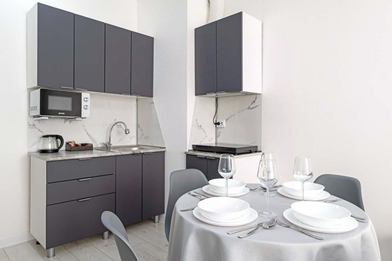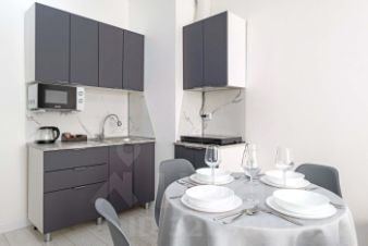 - В кухонной зоне: микроволновая печь, холодильник, плита, чайник, вытяжка, посуда и столовые приборы на любой случай. Чай, кофе, сахар, соль, конфеты.
