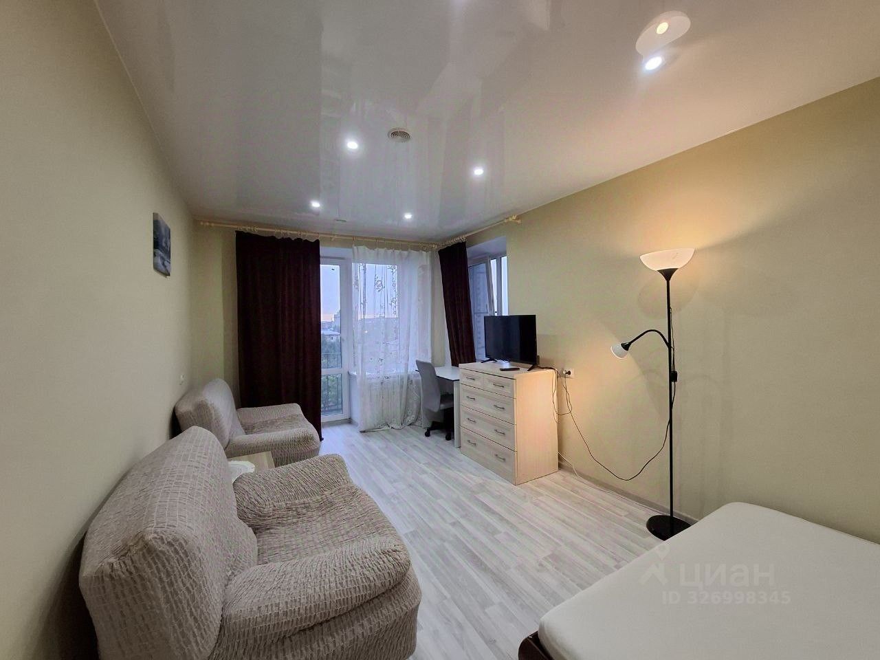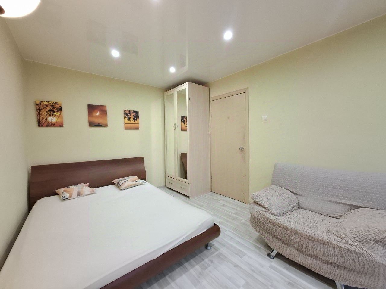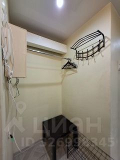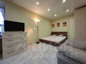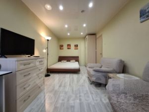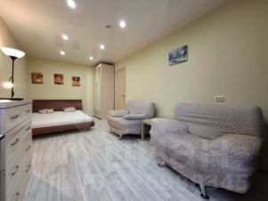 В квартире большая комната со спальным местом, шкафом, комодом, телевизором и зоной отдыха. Кухня полностью оснащена мебелью и техникой. Есть холодильник, плита, стиральная машина, микроволновка. Всё в рабочем состоянии.
