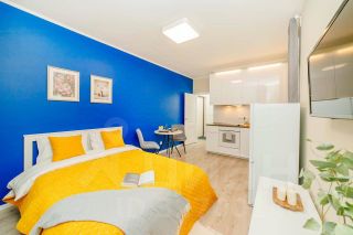 Эта квартира - гимн мягкому контрасту. Представьте: идеально белая мебель, нежный, цвета дуба пол - словно чистое полотно, на котором разворачивается история вашего уюта. Глубокий, насыщенный синий цвет акцентной стены задает ей настроение глубины и спокойствия, а яркие жёлтые и зелёные детали - подушки, плед, искусственные растения - разбавляют тишину искрами радости и жизни. Серые шторы деликатно обрамляют эту картину, позволяя свету играть главную роль.