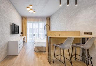 Просторная зона отдыха, обеденная зона с барной стойкой, рабочая зона, совмещенная ванная комната.