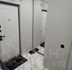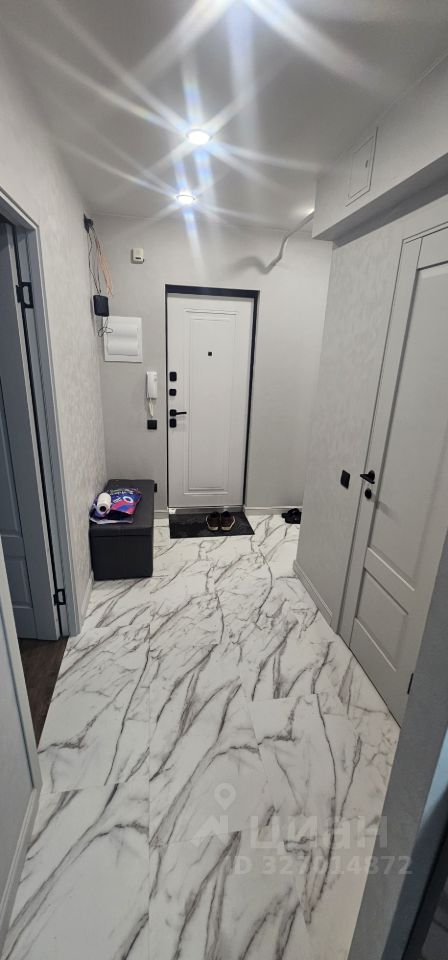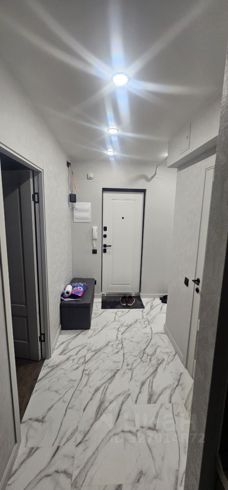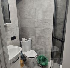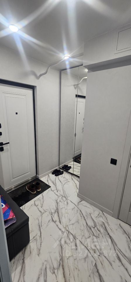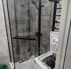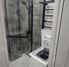Санузел совмещенный, оформлен в современном стиле с душевой кабиной и стиральной машиной. В прихожей предусмотрены удобные полки для обуви и верхней одежды.