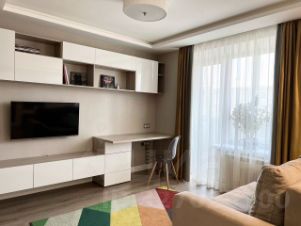 Квартира оформлена в дизайнерском стиле, что создаёт атмосферу уюта и комфорта. В распоряжении арендаторов есть вся необходимая техника: кондиционер, холодильник, телевизор и стиральная машина. Высота потолков — 2,5 метра, что добавляет ощущения простора. Санузел оборудован всем необходимым для комфорта.