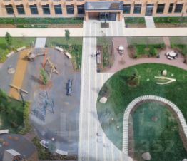 Закрытый двор без машин c современной детской площадкой.