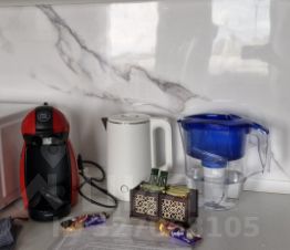 - Обеденная зона: индукционная плита, холодильник, кофемашина, чайник, микроволновка, посудомойка, посуда на 2 персоны, стол со стульями, фильтр для воды.