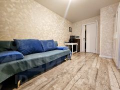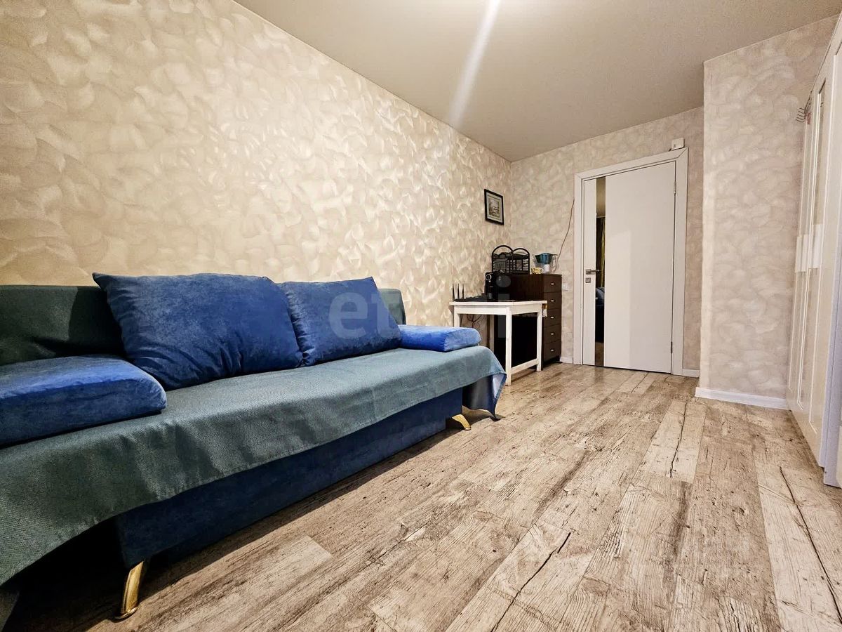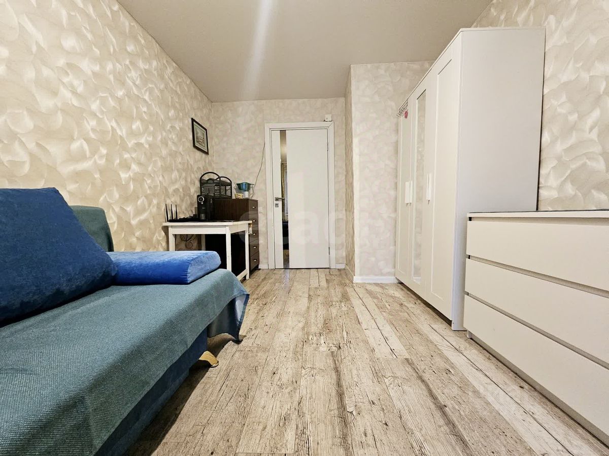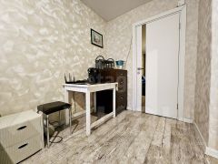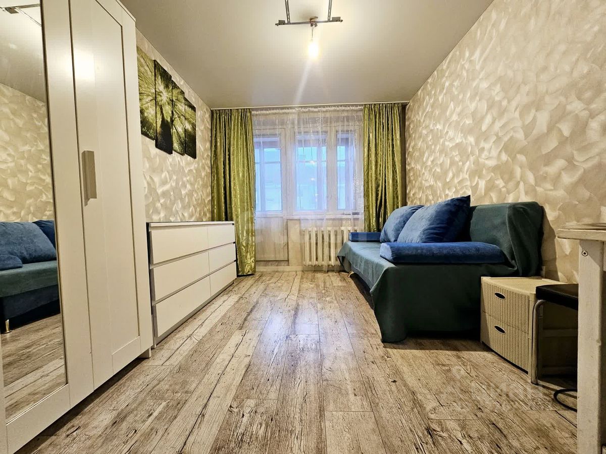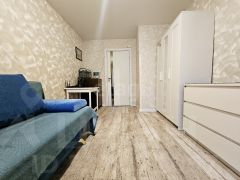 Комната светлая, чистая, в хорошем состоянии, с аккуратным современным ремонтом. На полу качественное напольное покрытие под дерево, стены оформлены в светлых спокойных тонах, за счёт чего пространство выглядит просторно и уютно.
