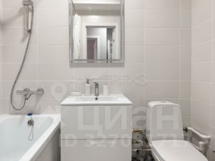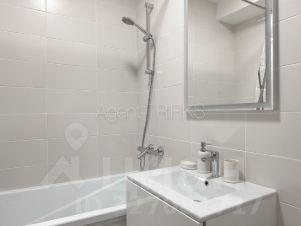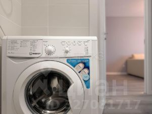 В санузле установлена полноценная ванна, стиральная машина и зеркало с подсветкой .