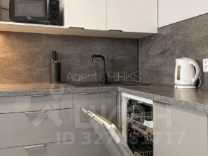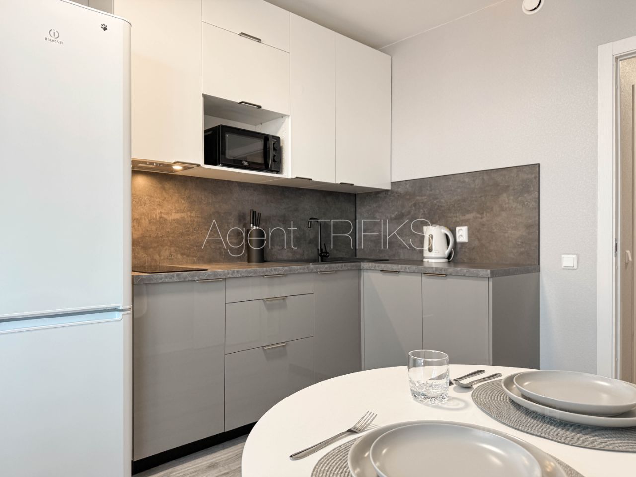 Кухня оснащена гарнитуром, встроена посудомоечная машина, есть микроволновка и варочная панель с угольным фильтром.