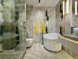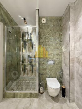 Ванная комната оснащена каменной раковиной с большим зеркалом, душевой кабиной, небольшой ванной.