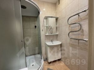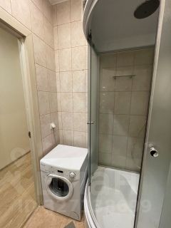 В санузле душевая кабина, тумба с зеркальным шкафчиком, полотенцесушитель из нержавеющей стали (водяной), стиральная машина Candy.