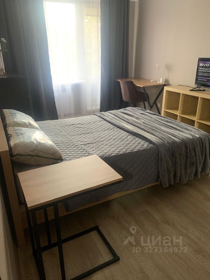 В жилой комнате расположилась большая двуспальная кровать с новым ортопедическим матрасом, а также вместительный шкаф Икея с удобной системой хранения, комод, прикроватный столик, телевизор с функцией Smart TV, современное рабочее место в виде письменного стола и кресла.
