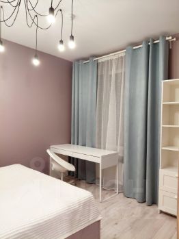 Уютная спальня оборудована большой кроватью с ортопедическим матрасом и подъемным механизмом для хранения вещей, рабочим столом, офисным креслом, комодом и стеллажом. Установлены блэкаут гардины для полного затемнения.