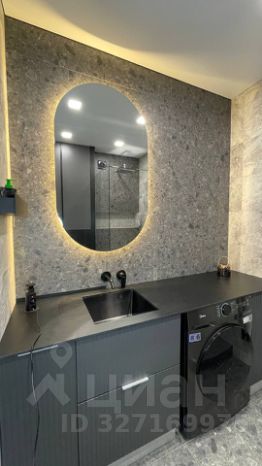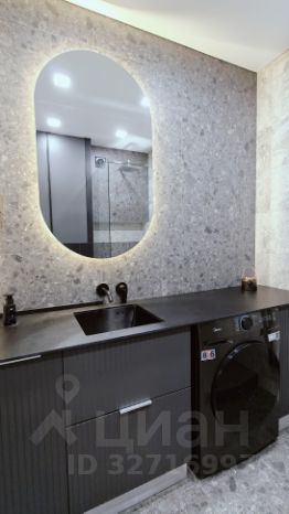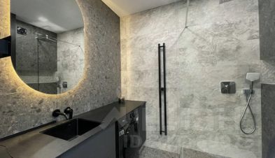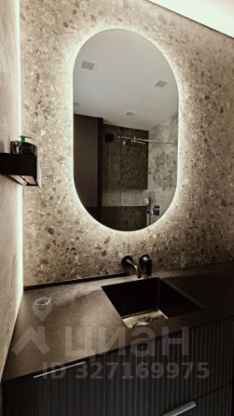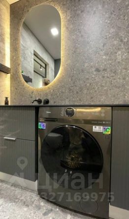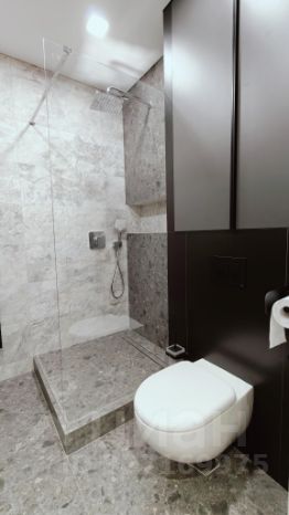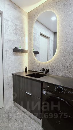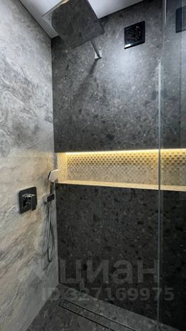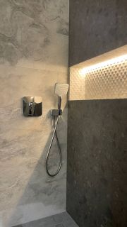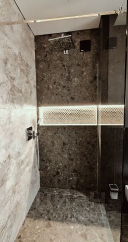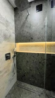 Оборудована душевой с тропическим душем ,удобными нишами, подвесным унитазом с гиг душем. В ванной есть мини прачечная со стирально-сушильной машиной и удобными шкафами. Также есть защита от протечек. Дизайнерский полотенцесушитель с крючками для халатов. В отделке использован большеформатный керамогранит испанского люксового бренда Porchelanosa. Везде установлена испанская и немецкая сантехника (Kludi и Clever).