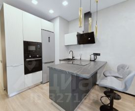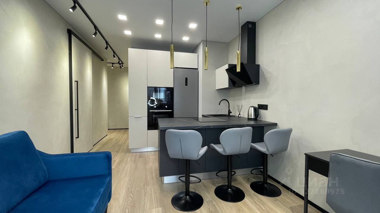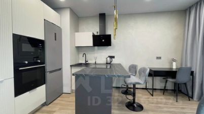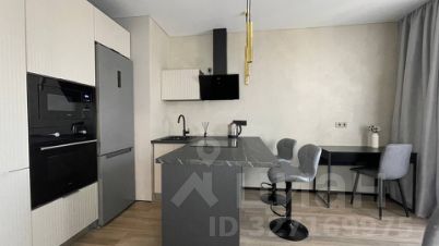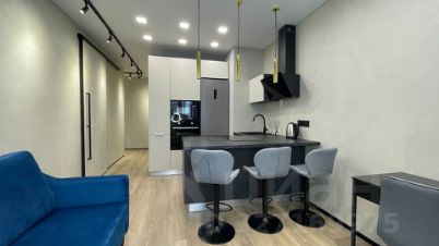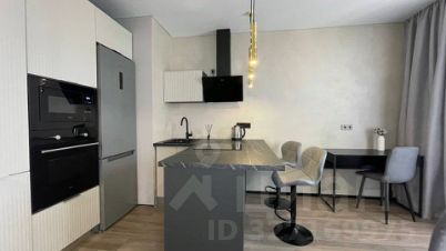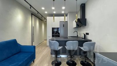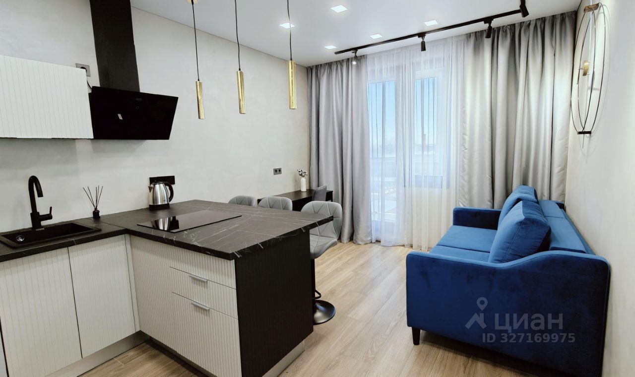 Полуостров делит её на 2 части. На кухню, в которой можно быстро приготовить обед или ужин, общаясь с друзьями, сидящими на диване в зоне гостиной или за барной стойкой. В гостиной удобный для отдыха диван и оборудовано рабочее место. Есть выход на лоджию.