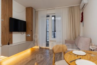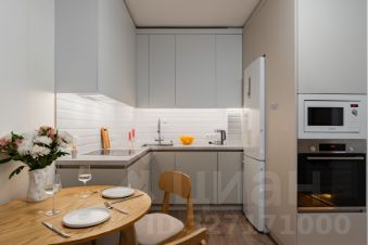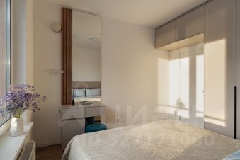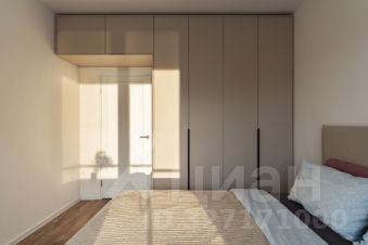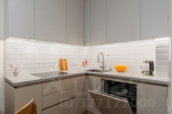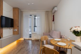 Квартира создавалась для длительного проживания, организовано много мест хранения: гардеробная в прихожей, встроенная система хранения в спальне, кровать с подъемным механизмом. Кухня оборудована техникой Bosch (духовка, варочная поверхность, микроволновка, посудомойка).