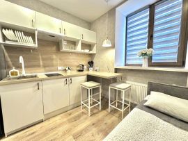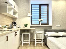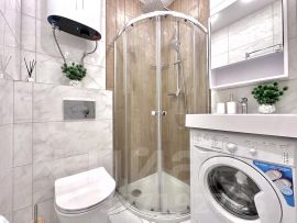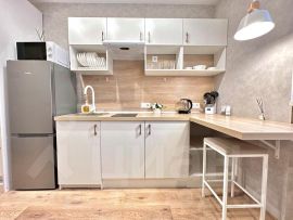 • Оснащение необходимой бытовой техникой позволит с комфортом проживать в апартаментах даже длительное время (набор посуды, плита, СВЧ, чайник, стиральная машина, утюг, телевизор, фен);