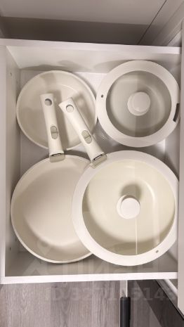 необходимая посуда, начиная от чайной ложки и до набора стильных кастрюль в бежевом цвете, ведро и швабра,