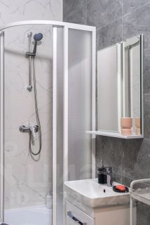 Санузел с душевой кабиной, стиральной машиной, полотенцами и средствами первой необходимости — чистый, свежий, аккуратный.