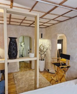Интерьер выполнен в духе ваби-саби — эстетика несовершенства и природной гармонии. Здесь натуральные фактуры, приглушённые цвета, мягкий свет и тактильно приятные материалы создают ощущение дома, где можно по-настоящему отдохнуть душой.