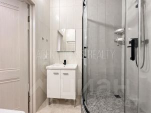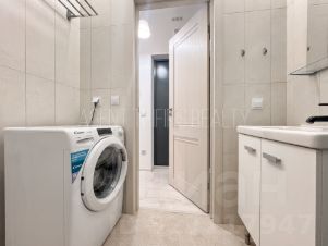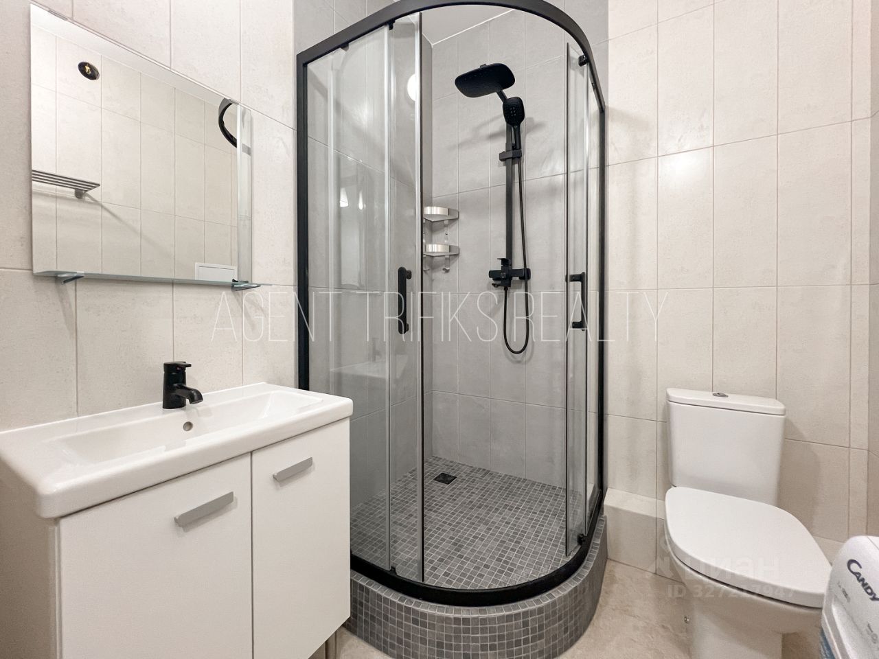 • Санузел: Совмещенный, с качественной отделкой. Установлена душевая кабина с тропическим душем и стильная черная сантехника. Есть стиральная машина Candy.