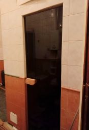 Большая ванная комната с сауной, душевой и ванной.