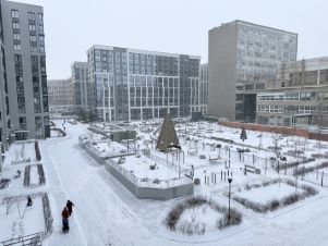 Закрытая территория комплекса, в центре комплекса, рядом с детской площадкой находится красивый фонтан.