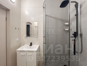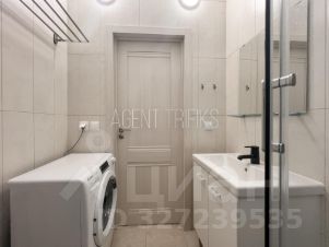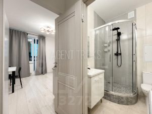 • Санузел: Совмещенный, с качественной отделкой. Установлена душевая кабина с тропическим душем и стильная черная сантехника. Есть стиральная машина Candy.