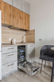 - Вся необходимая техника: стиральная и посудомоечная машины, микроволновка, варочная панель, холодильник, кондиционер, утюг.