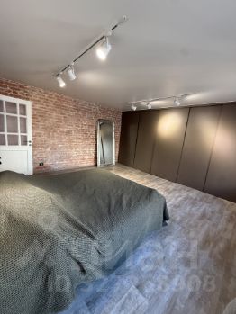 -В спальне минималистичная обстановка , включая шкаф во всю стену и кровать.