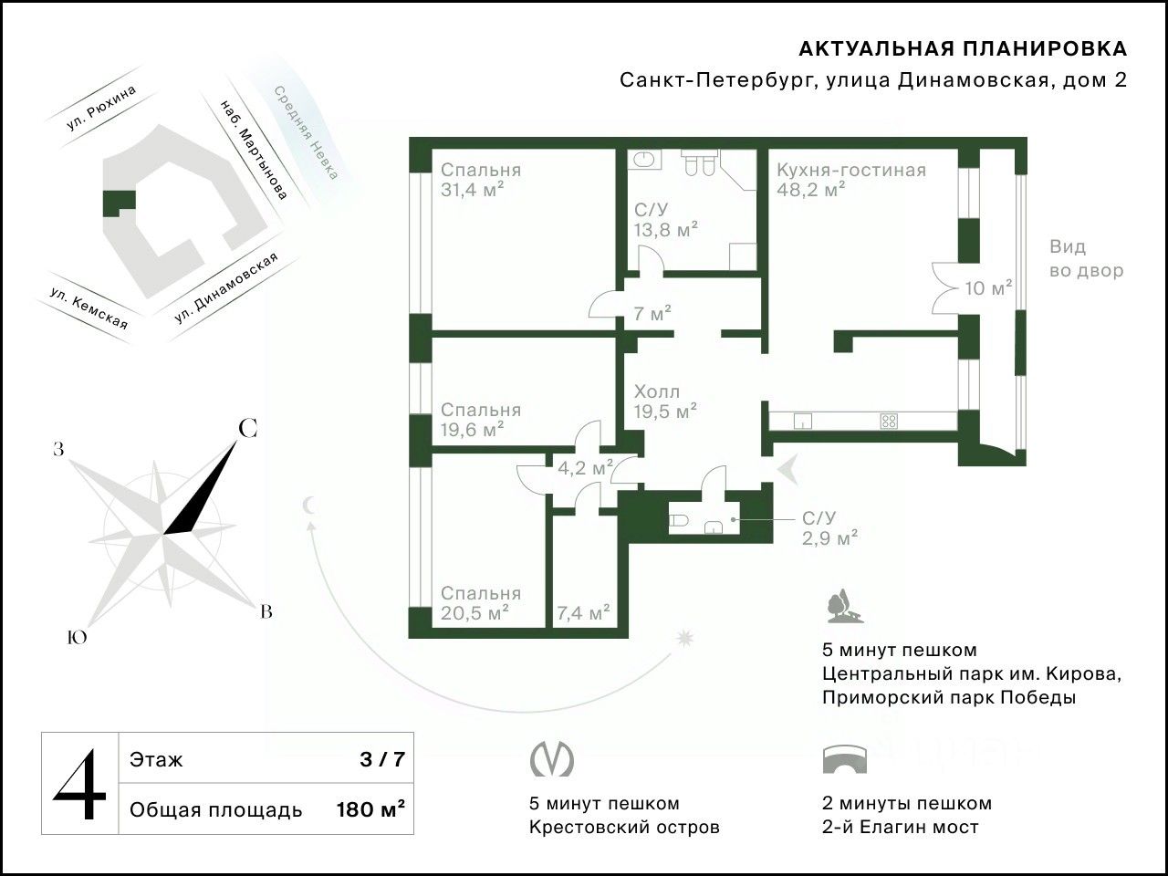 Арт. 131951186 Новый вариант в престижном районе — четырехкомнатная квартира в клубном доме 2005 года по улице Динамовская. Локация находится буквально в нескольких шагах от набережной Мартынова, поблизости от 2-го Елагина моста. Красивая и просторная квартира: