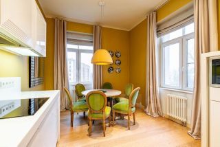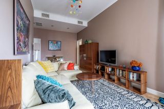 Квартира состоит из большой гостиной с уютным диваном, в комнате два панорамных окна с балконом, спальня с большой гардеробной и балконом, кухня-столовая, санузел, постирочная зона и отдельно гардеробная при входе, высота потолков 3,3 метра.