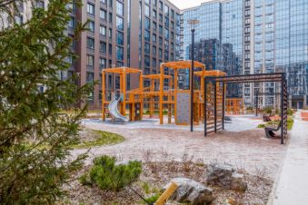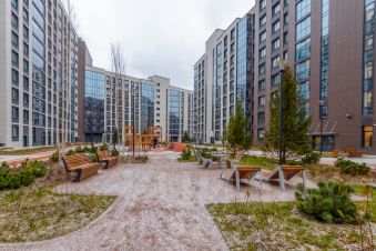 Закрытый зелёный двор с детскими площадками, тренажёрами, беговой дорожкой, уличными шахматами.