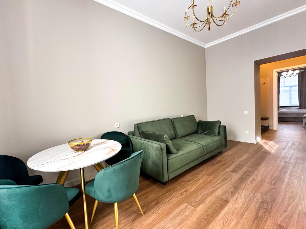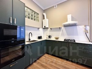Кухня-гостиная: Просторное светлое пространство. Есть посудомоечная машина, встроенные СВЧ и духовой шкаф, чайник и тостер. В гостевой зоне — раскладной диван, телевизор и кондиционер.