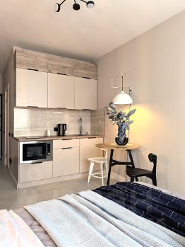 Вся необходимая техника (стиральная машина с сушкой, холодильник, индукционная варочная панель, микроволновая печь с конвекцией и грилем)