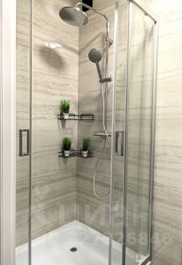 Стильный санузел с душевой кабиной с тропическим душем. Теплые полы.