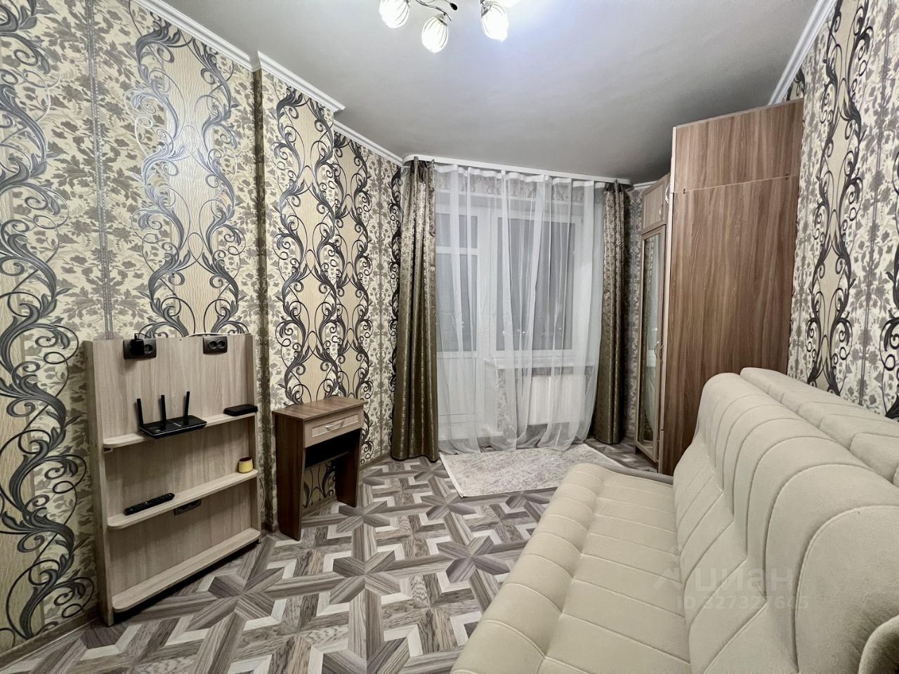 В комнате установлен удобный диван и вместительный угловой шкаф для хранения вещей.