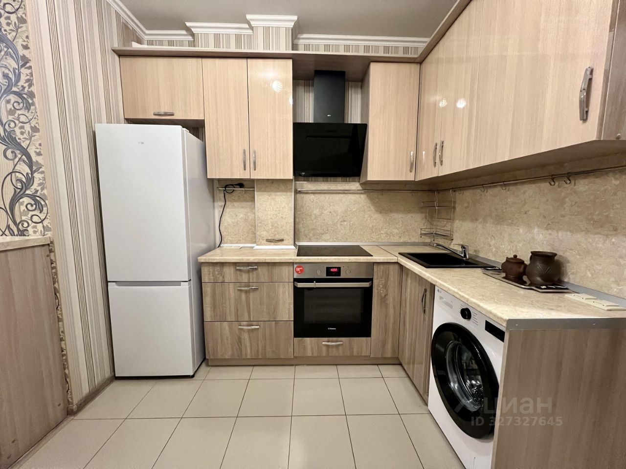 Внутри вас ждет современная кухня с необходимой бытовой техникой: холодильником, встроенной варочной поверхностью, духовым шкафом, вытяжкой и стиральной машиной.